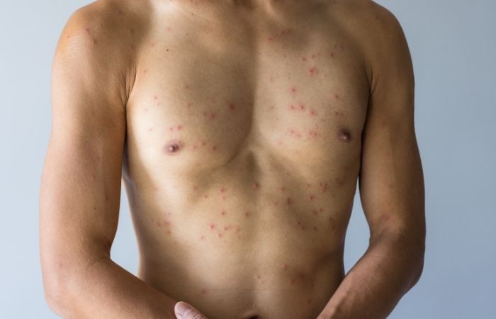 Secondary syphilis is famous for causing a rash on the hands and feet. According to the Mayo Clinic, this rash often doesn’t itch, which makes it easier to ignore. Some men also experience patchy hair loss or low-grade fever.