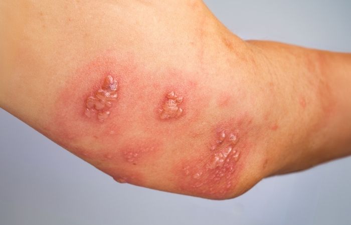 It’s usually small red or purplish spots, sometimes with tiny blisters or a slightly raised center. People often notice them on their palms, soles, or around inflamed joints. It doesn’t usually itch like an allergic reaction. It looks… medical. Subtle but strange.
