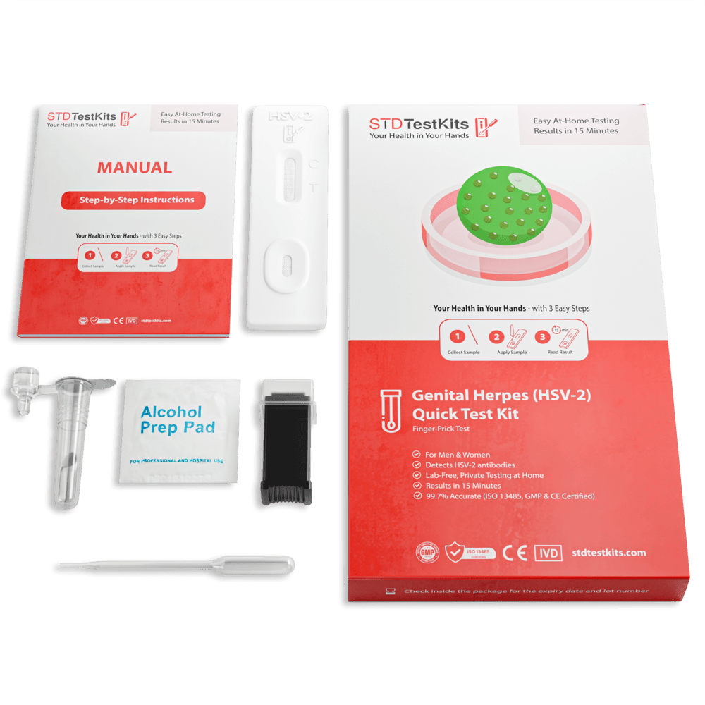 Our Genital Herpes (HSV-2) At-Home Test Kit puts control in your hands. Skip the clinic, this simple finger-prick blood test delivers reliable results in just 15 minutes, with 98.3% clinically validated accuracy. It’s fully private (ISO 13485, GMP, and CE certified) and comes in unmarked packaging with neutral billing to protect your confidentiality.